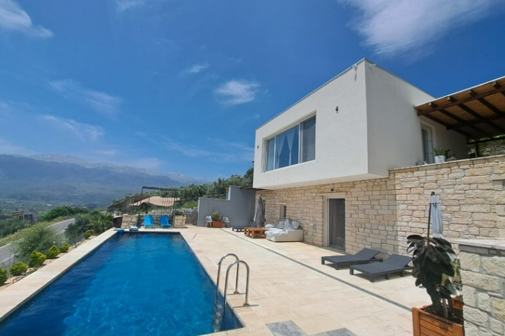 Perched high on a scenic hillside just outside the charming village of Vamos, this architecturally striking and impeccably built modern villa offers absolute privacy, awe-inspiring mountain views, and seamless year-round comfort — all within minutes of essential local amenities.